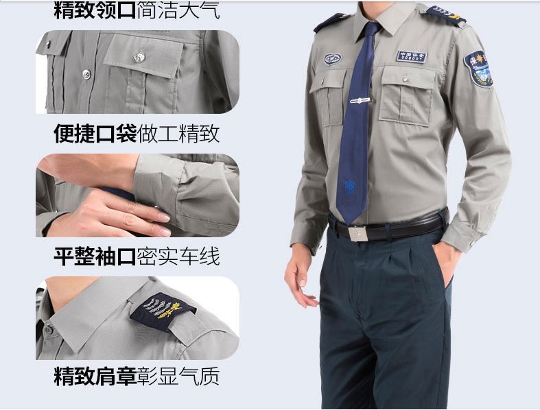 新式保安员服装设计从服饰到颜色均有很大的突破,整体采用庄重沉稳的深色系(蓝灰色外衣搭配浅灰色衬衣)职业服装设计,较好地体现保安工作性质和保安员提供安全服务的职业特性,激发了保安员的职业自豪感和荣誉感,提升了保安队伍的整体形象。